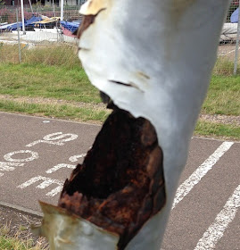 As you can see from the two pictures, the post, for these signs and the bin, is badly corroded and needs replacement.